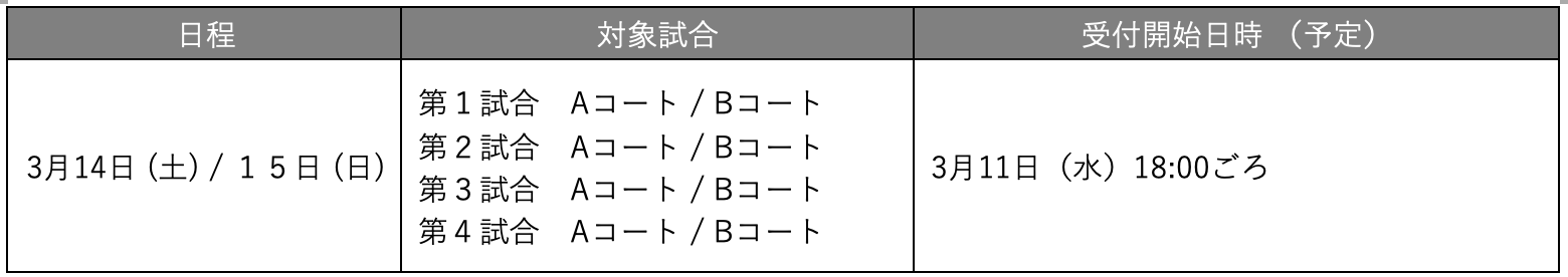 - ・チケットは残券がある場合に限り、試合当日最終試合のハーフタイム終了予定時刻まで販売します。